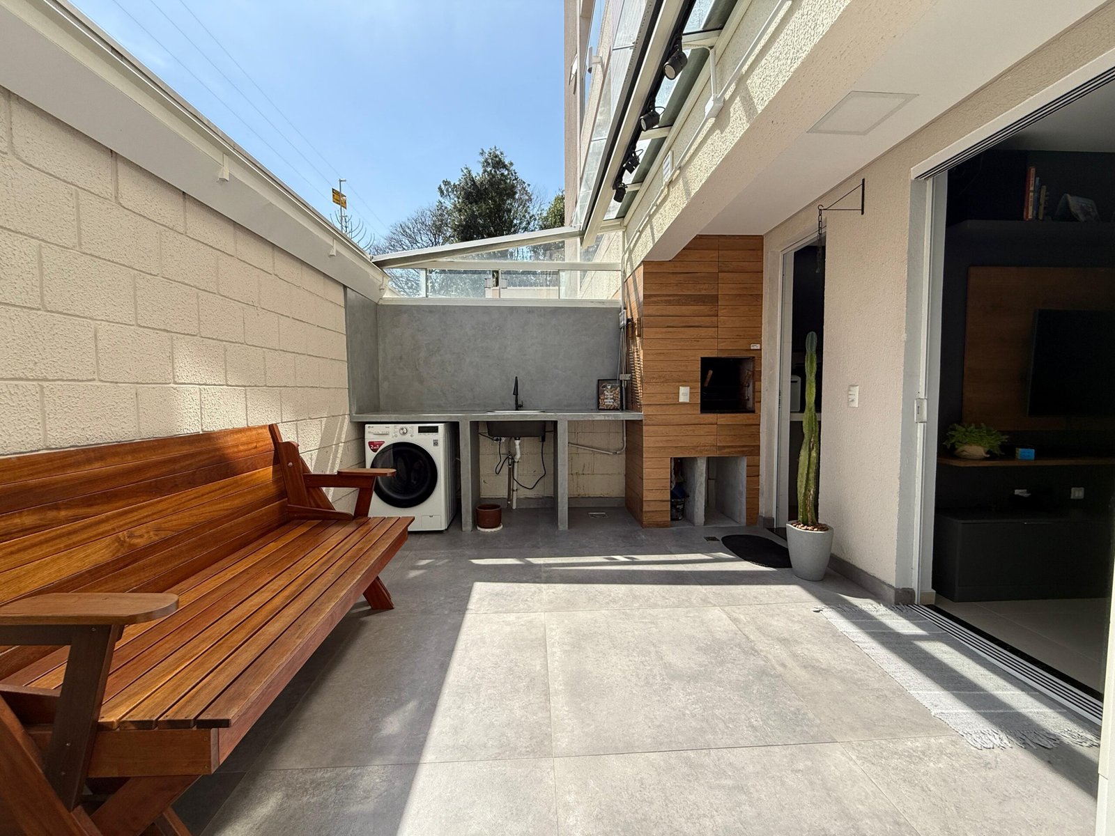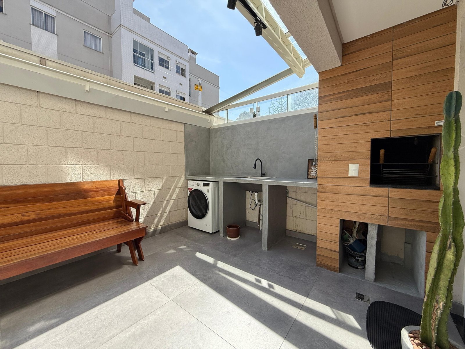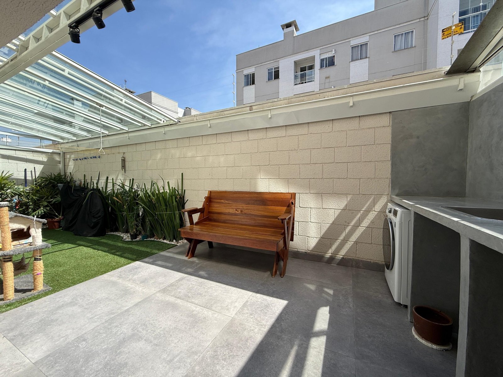 Um destaque para a área externa que conta com cobertura retrátil.