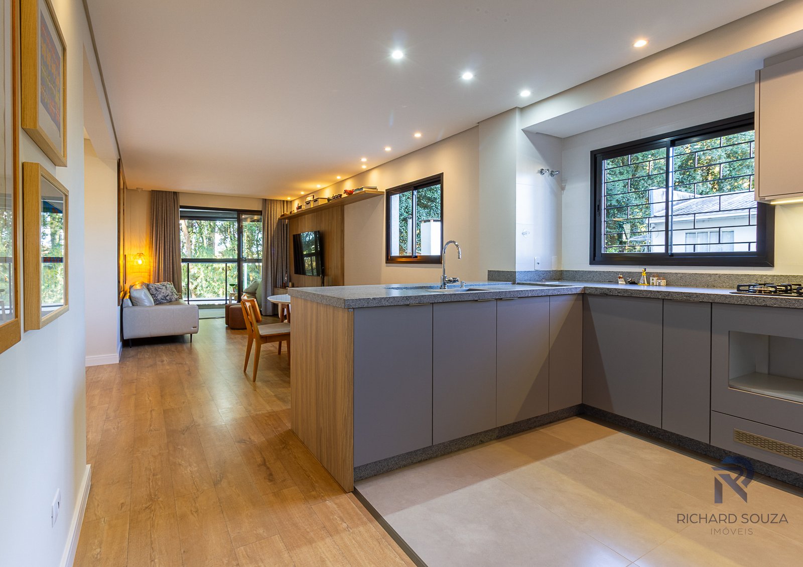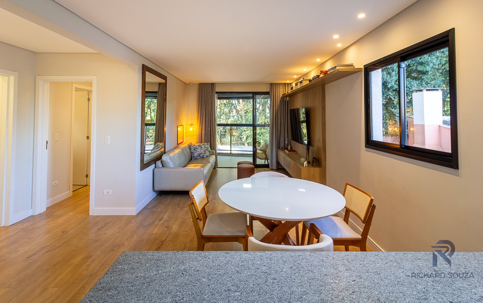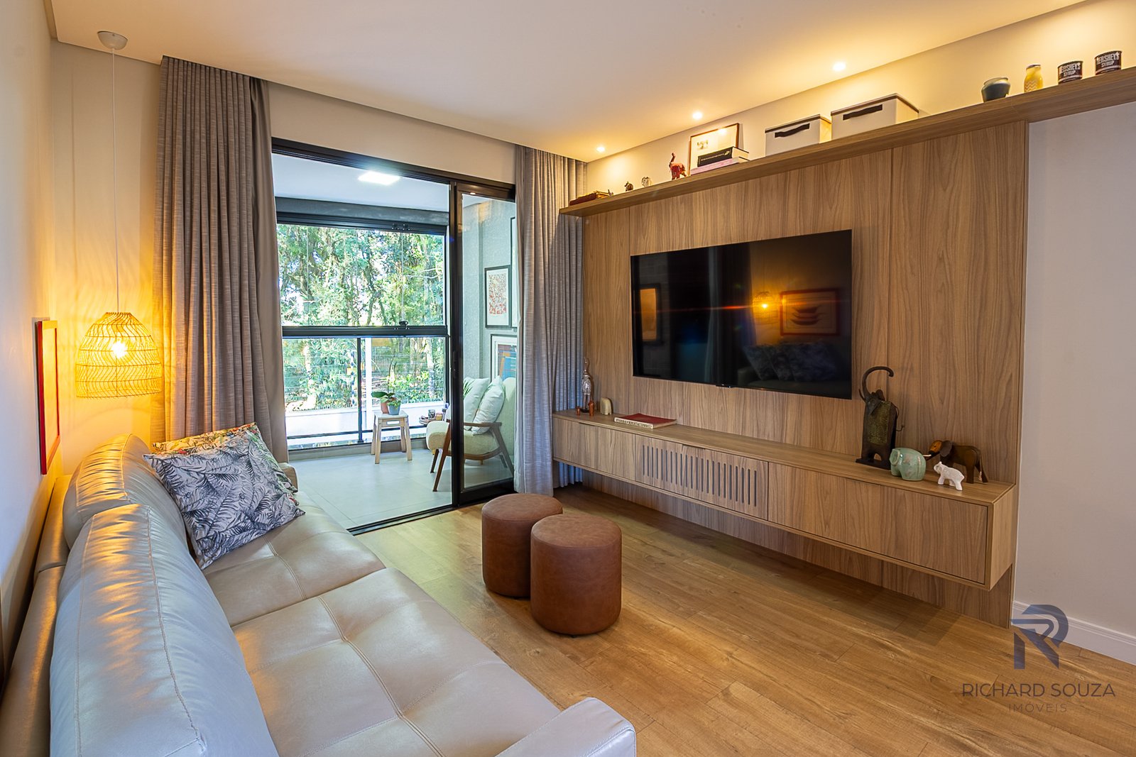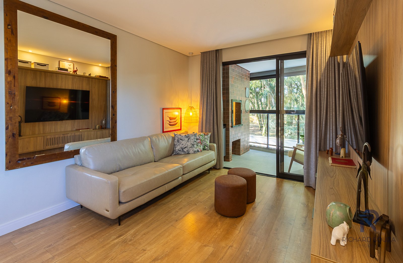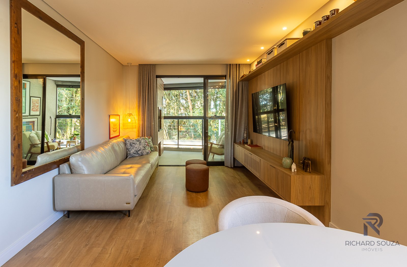 Imóvel todo mobiliado em conceito aberto, possui um sacada com churrasqueira generosa e vista definitiva para uma preservação.