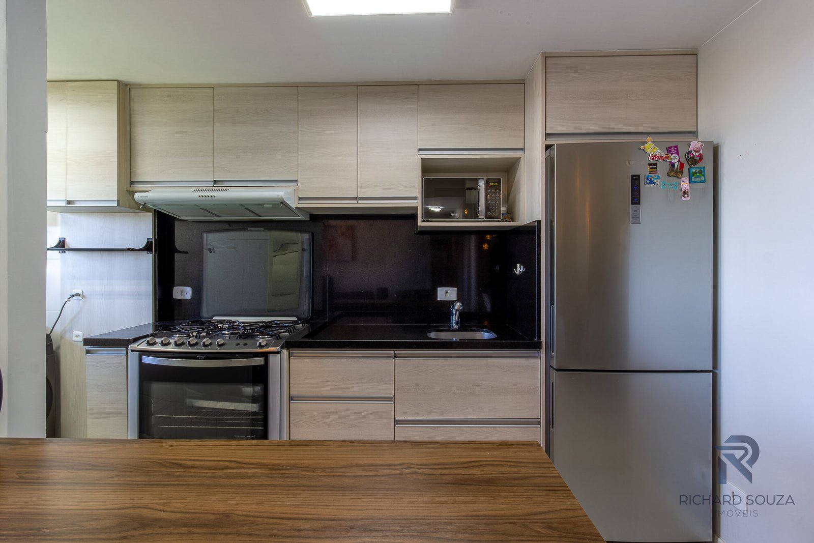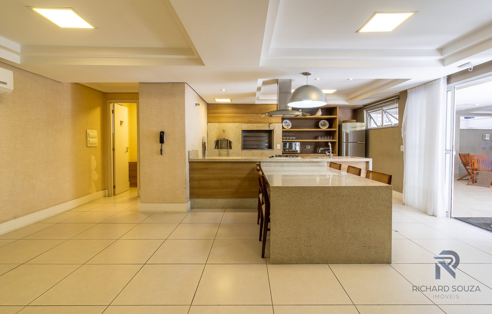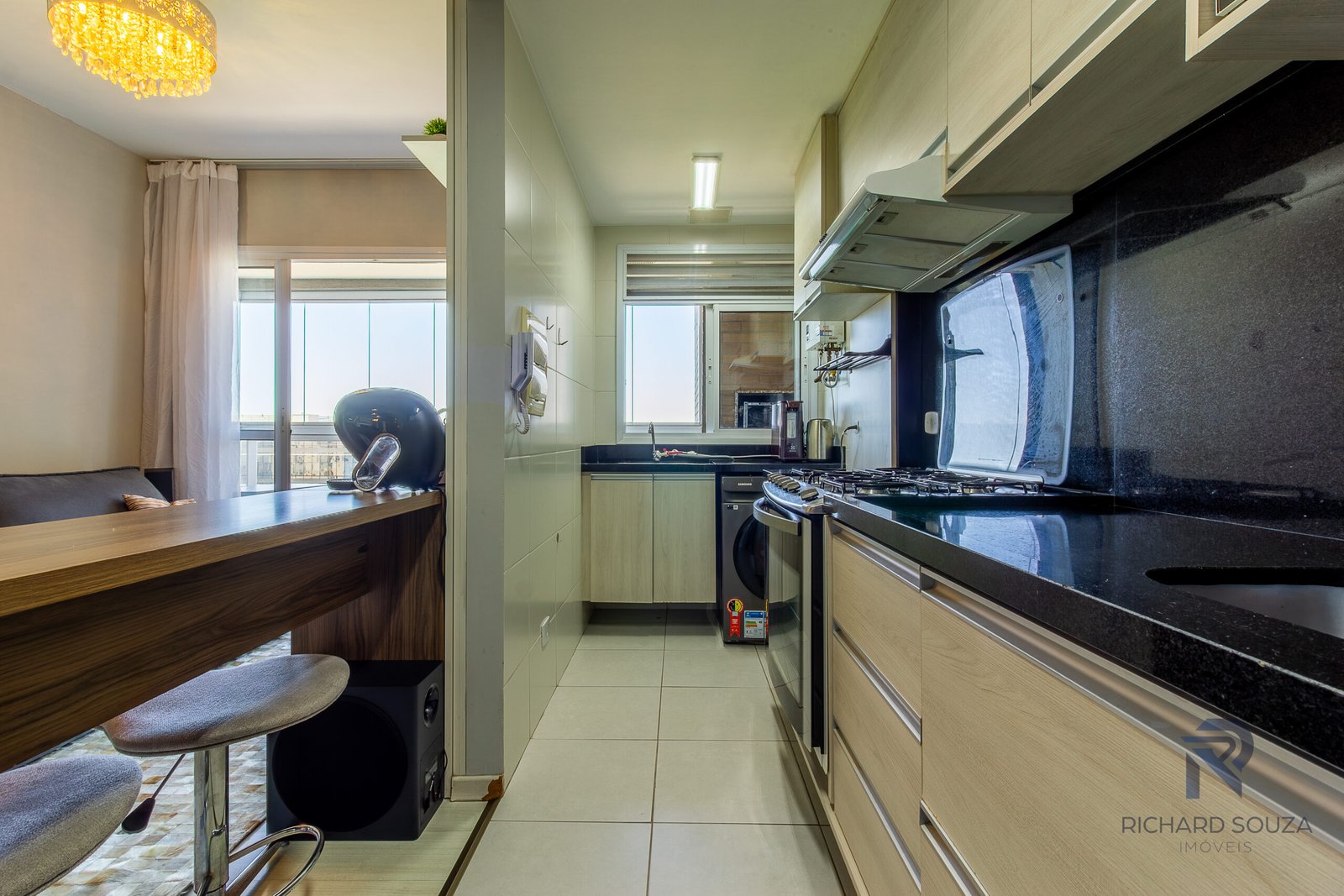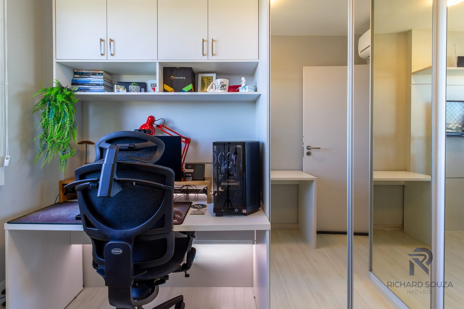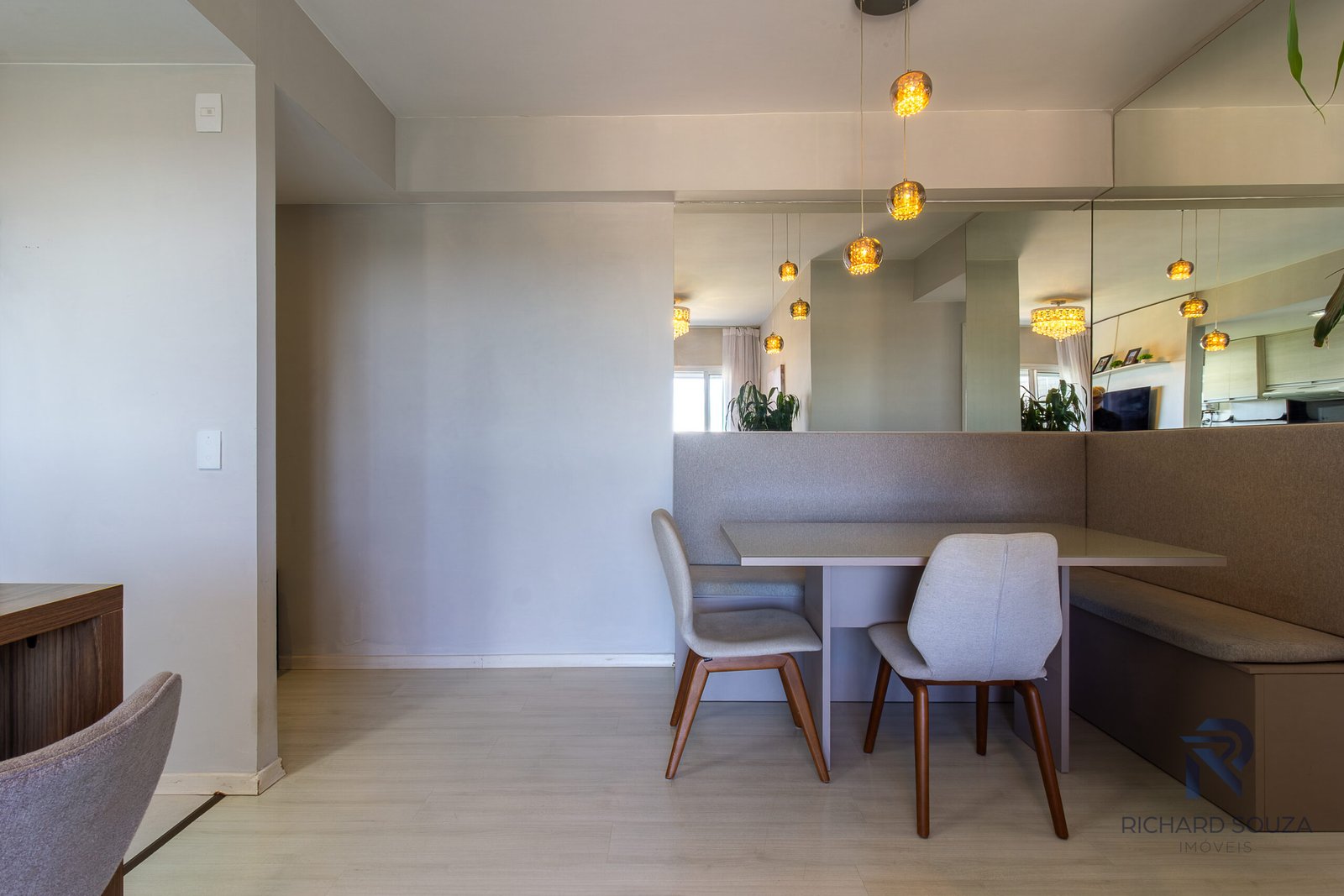 São 3 dormitórios, sendo uma suíte e 77m2 privativos.