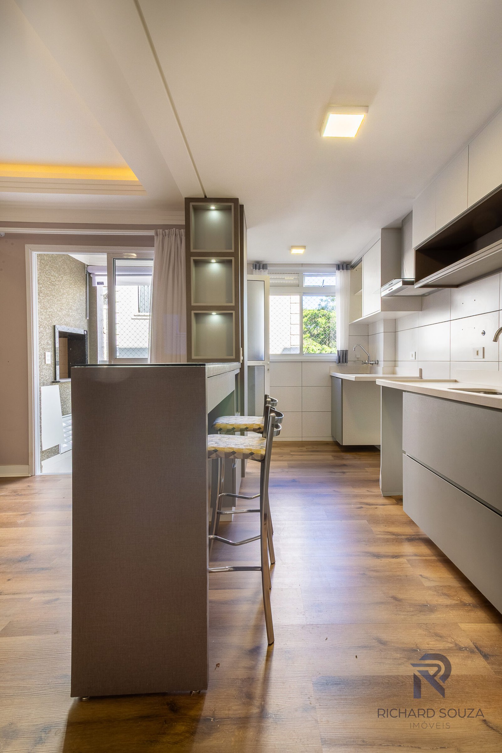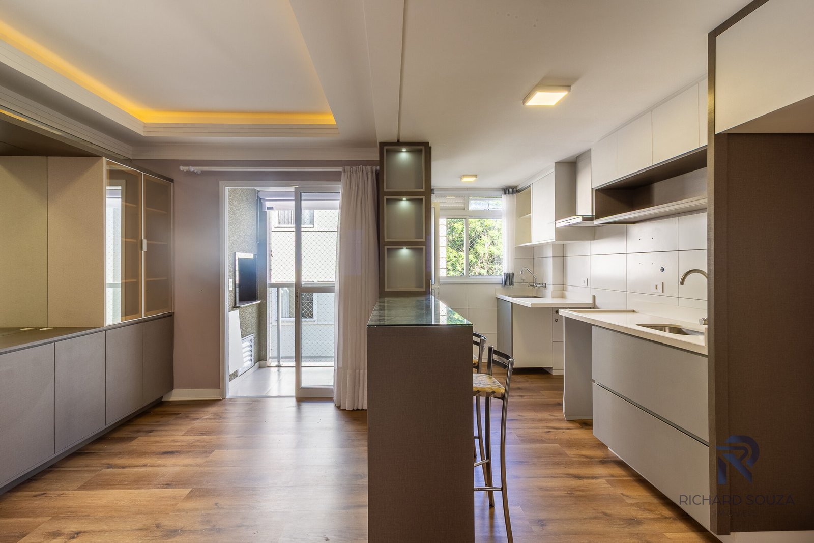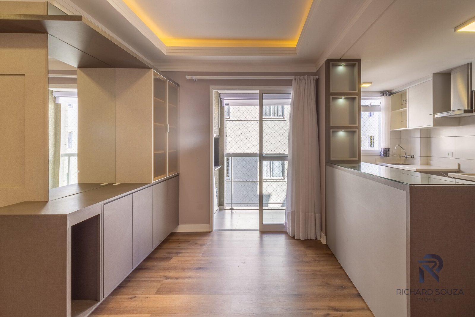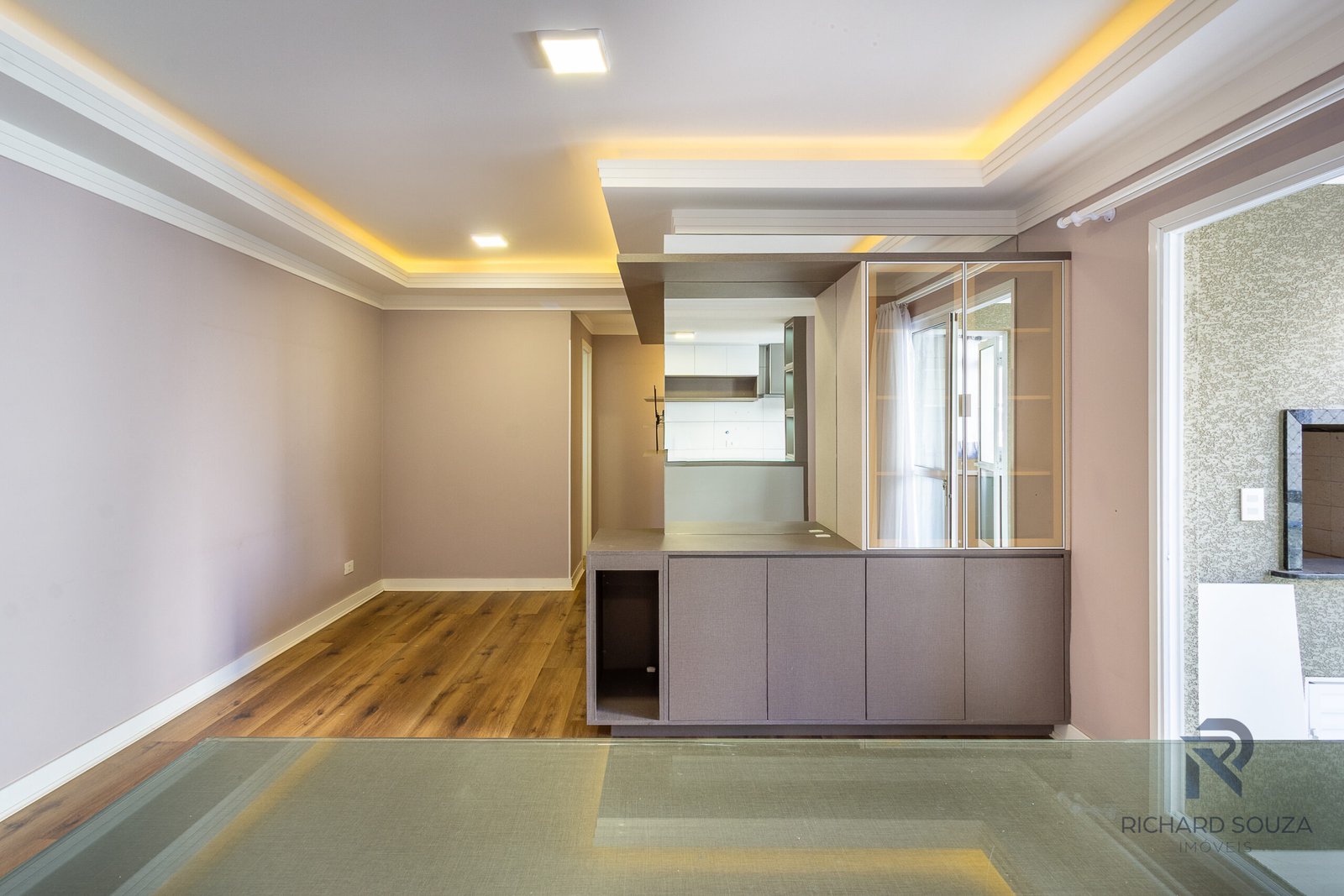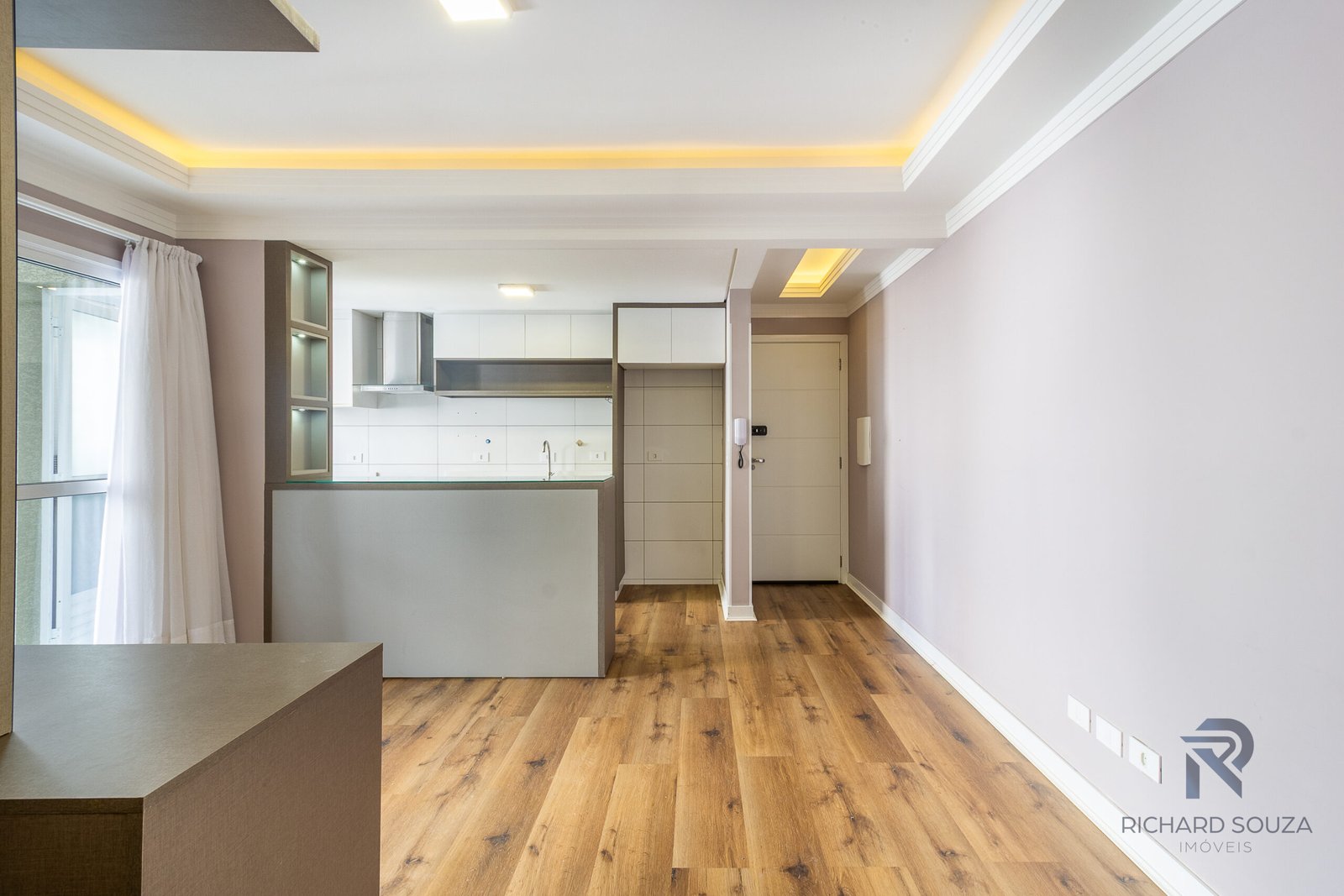 Luzes indiretas e amarelas abraçam a área social.