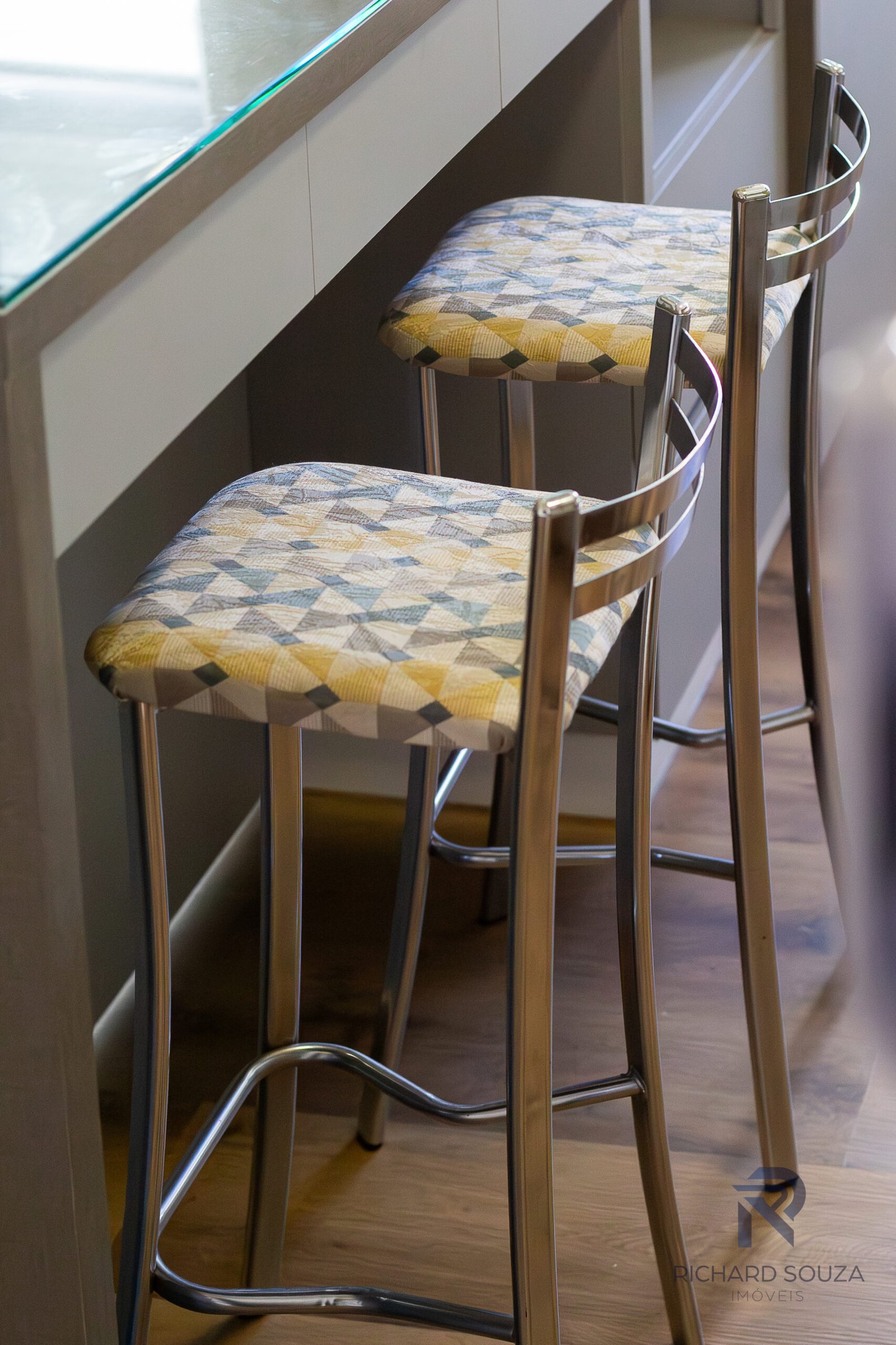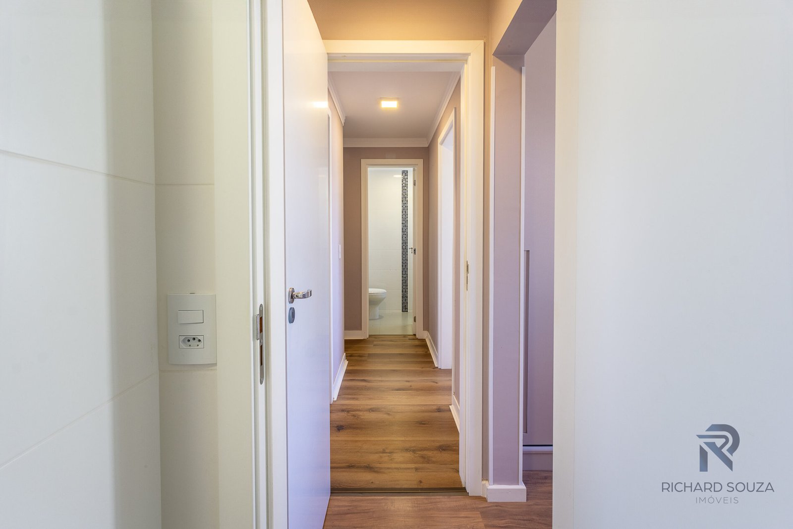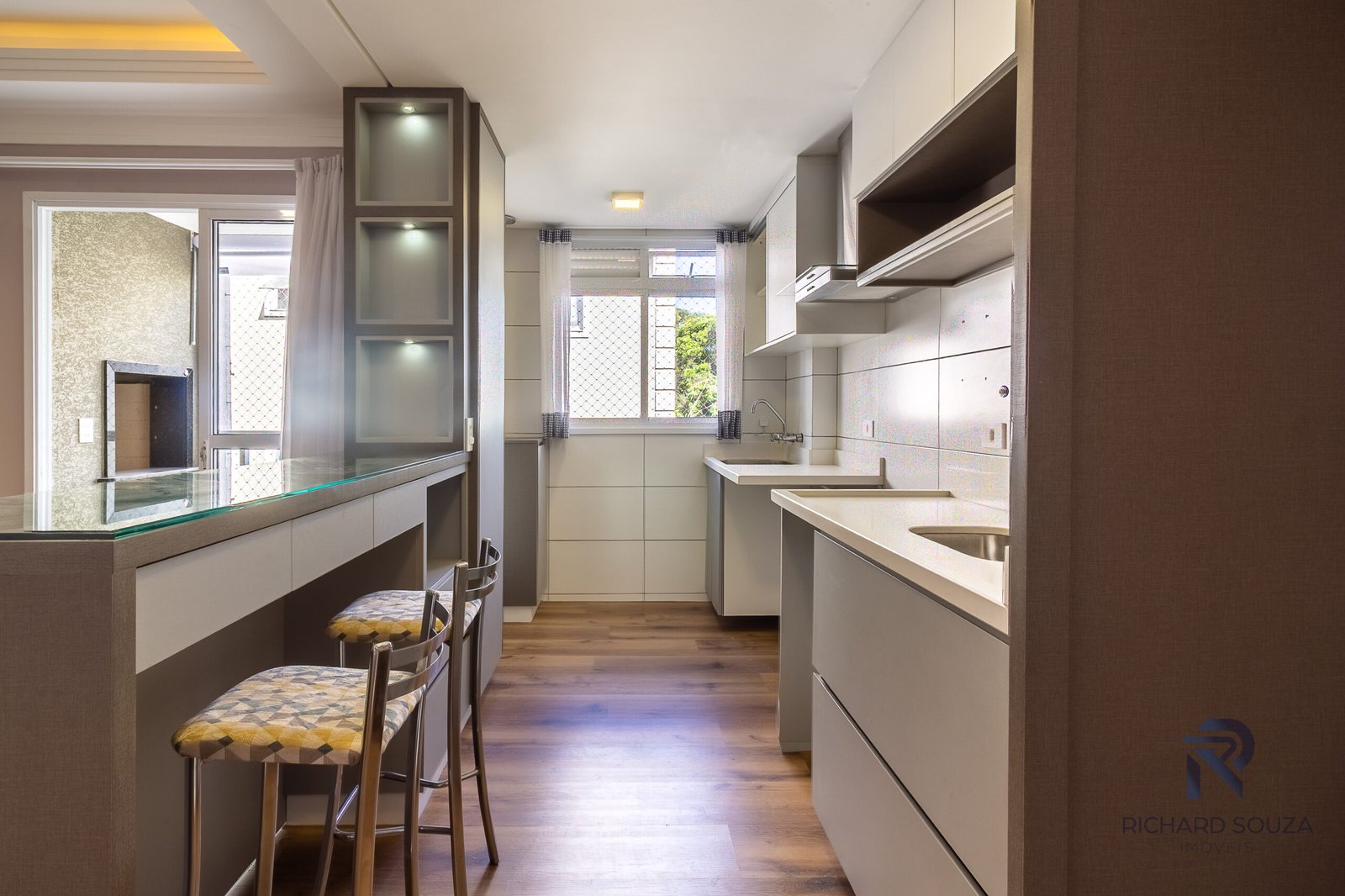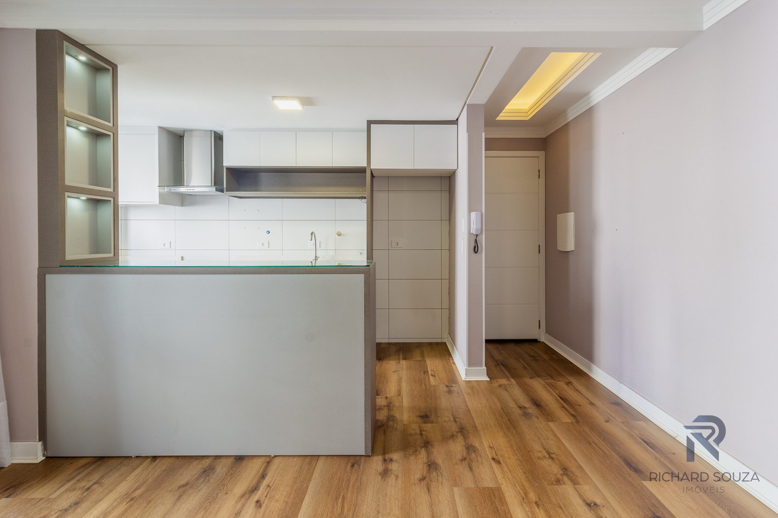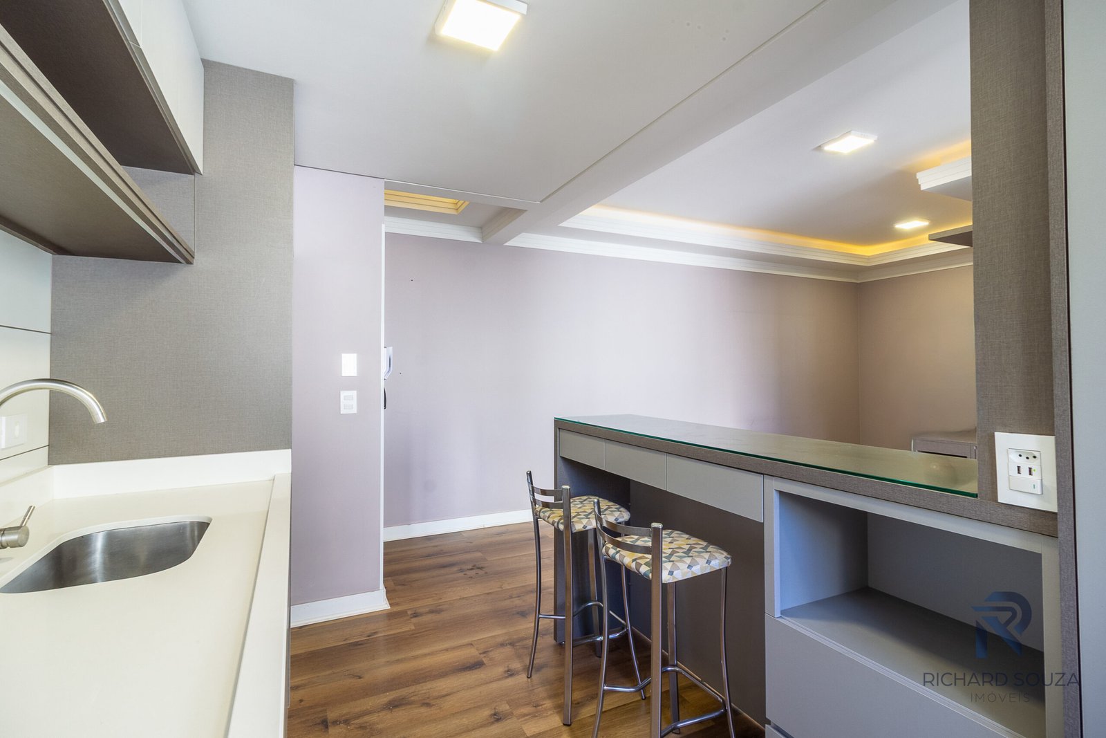 Luzes indiretas e amarelas abraçam a área social.