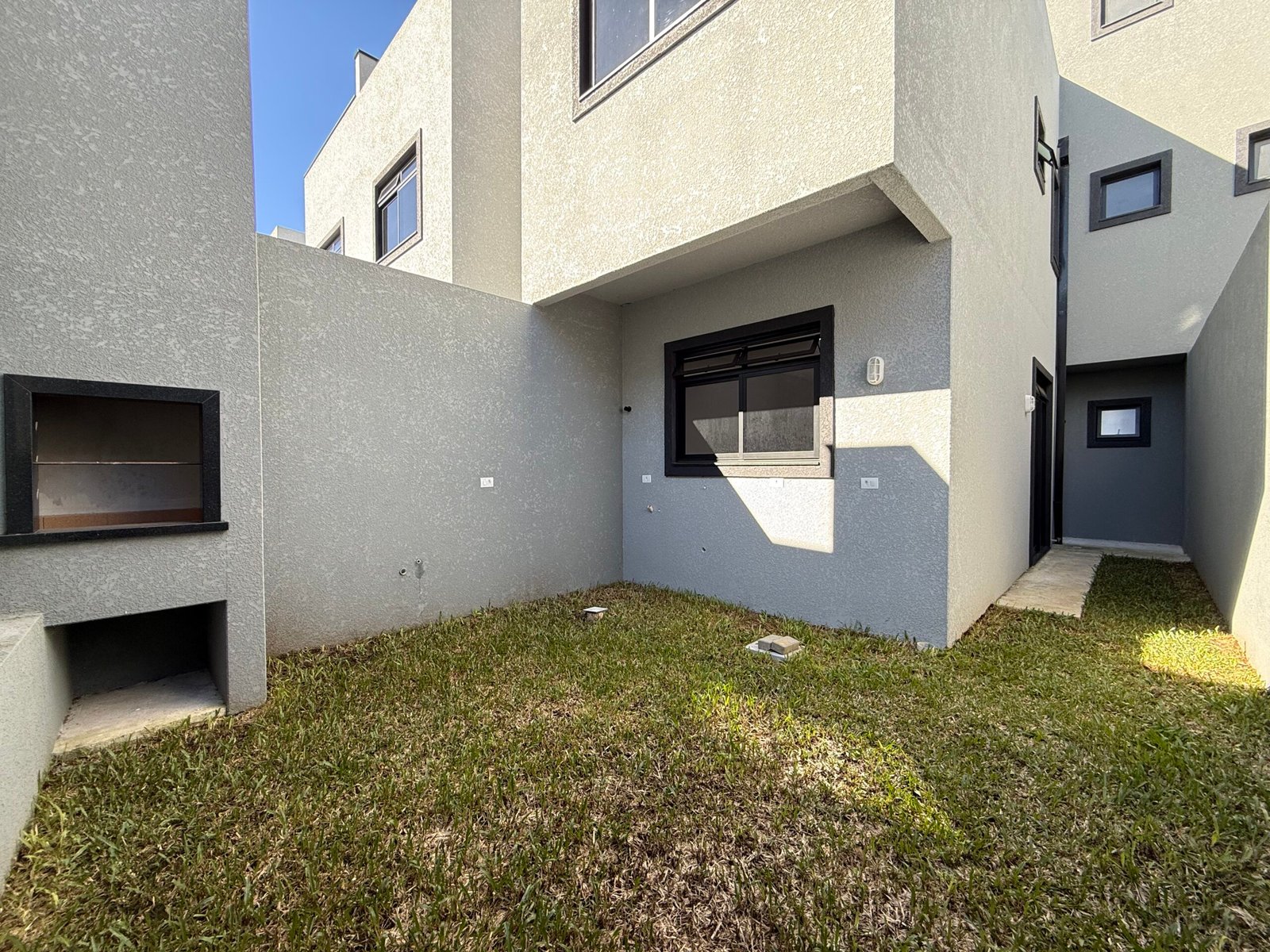 Imóvel possui 3 dormitórios, sendo uma suíte e terreno com grama e churrasqueira na parte dos fundos.